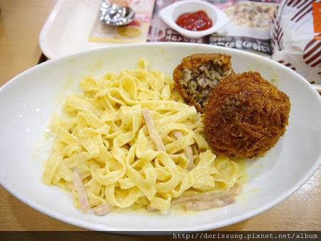 老婆點的カルボナーラ,出乎意料之外的好吃,畢竟這只是間速食店XD 牛肉丸子是順便放進去一起吃的XD